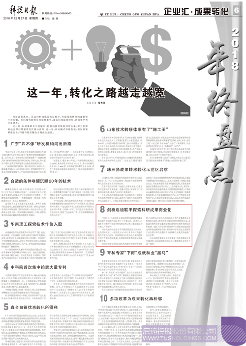 12月27日,科技日報刊文《這一年,轉化之路越走越寬》,文中提到:科技改變未來。在邁向科技強國的征程中,科技成果轉化的重要性不言而喻。在科技創新的馬拉松競賽中,落實科技成果轉化,對接生產力才是終點。這一年,以成果轉化為突破口,打好科技創新系列組合拳,努力發揮科技支撐引領新常態的核心作用;這一年,轉化模式不斷創新,利好政策頻頻出臺,科技與經濟融合之路越走越寬。