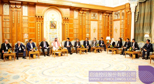 啟迪控股董事、啟迪國際董事長馬志剛(右八)代表啟迪控股出席與沙特王儲穆罕默德·本·薩勒曼(左五)對話的企業家座談會
