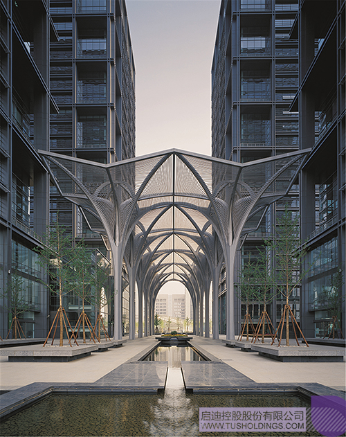 分列的四塔間隙為城市道路通向園區中心綠地打開了一條綠色通廊,中心是12顆參天鋼樹,形成灰空間的限定,與二層平臺自然的樹木共同營造出積極的公共交往空間。“樹影婆娑”下是綠意盎然的休閑廣場,展現人與自然共生共融的景象。建筑首層斜插入地下的草坪,標準層四角的綠色陽臺和頂層白色膜傘的屋頂花園無不體現了人性化、生態化的現代商務辦公理念。