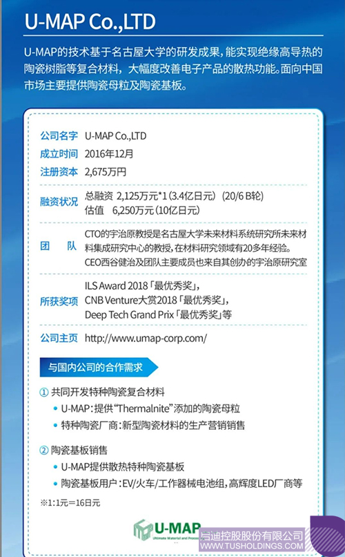 U-MAP則是基于本公司的纖維狀氮化鋁單晶添加劑“Thermalnite”,提供具有絕緣、高導熱性能的陶瓷母粒和基板。同時U-MAP也非常希望能與中國公司一道開發(fā)特種陶瓷復合材料。