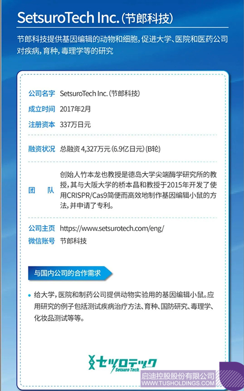 SetsuroTech(節(jié)郎科技)主要面向大學、醫(yī)院和醫(yī)藥公司提供基因編輯的動物和細胞。