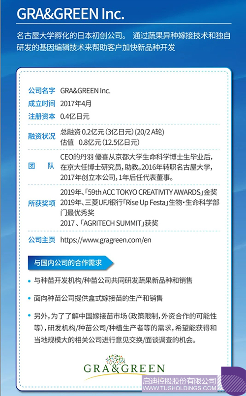 會上,啟迪控股高級副總裁楊明、愛知縣經(jīng)濟產(chǎn)業(yè)局創(chuàng)業(yè)推進部長柴山政明分別致辭。楊明表示,本次對接會對啟迪與日本愛知縣的合作來說具有重要意義,希望4家日本科創(chuàng)企業(yè)通過對接會,能與中國企業(yè)達成后續(xù)合作,預祝對接會取得圓滿成功。柴山政明對日本愛知縣的科創(chuàng)企業(yè)扶持戰(zhàn)略進行了總體介紹,其中特別強調(diào)了與清華大學合作對該戰(zhàn)略的重要性,對于本次與啟迪控股的合作表達了期待。會議由啟迪控股國際合作經(jīng)理、啟迪之星日本總經(jīng)理尚薇主持。本次路演共有4家對與中國合作落地感興趣的日本科創(chuàng)企業(yè)參加,分別是農(nóng)業(yè)科技領(lǐng)域的GRA&GREEN、生產(chǎn)管理軟件研發(fā)領(lǐng)域的SWIMMER、基因編輯技術(shù)領(lǐng)域的SetsuroTech和新材料領(lǐng)域的U-MAP。GRA&GREEN主要通過蔬果異種嫁接技術(shù)和獨自研發(fā)的基因編輯技術(shù)來加快新品種開發(fā),此外還進行盒式嫁接苗的生產(chǎn)和銷售。