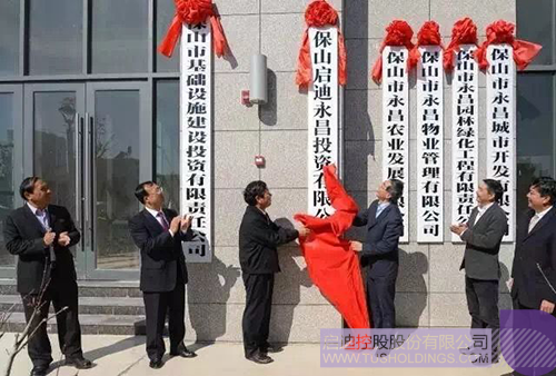 姜?jiǎng)僖ㄓ胰┡c趙德光(左三)共同為保山啟迪永昌投資有限公司揭牌